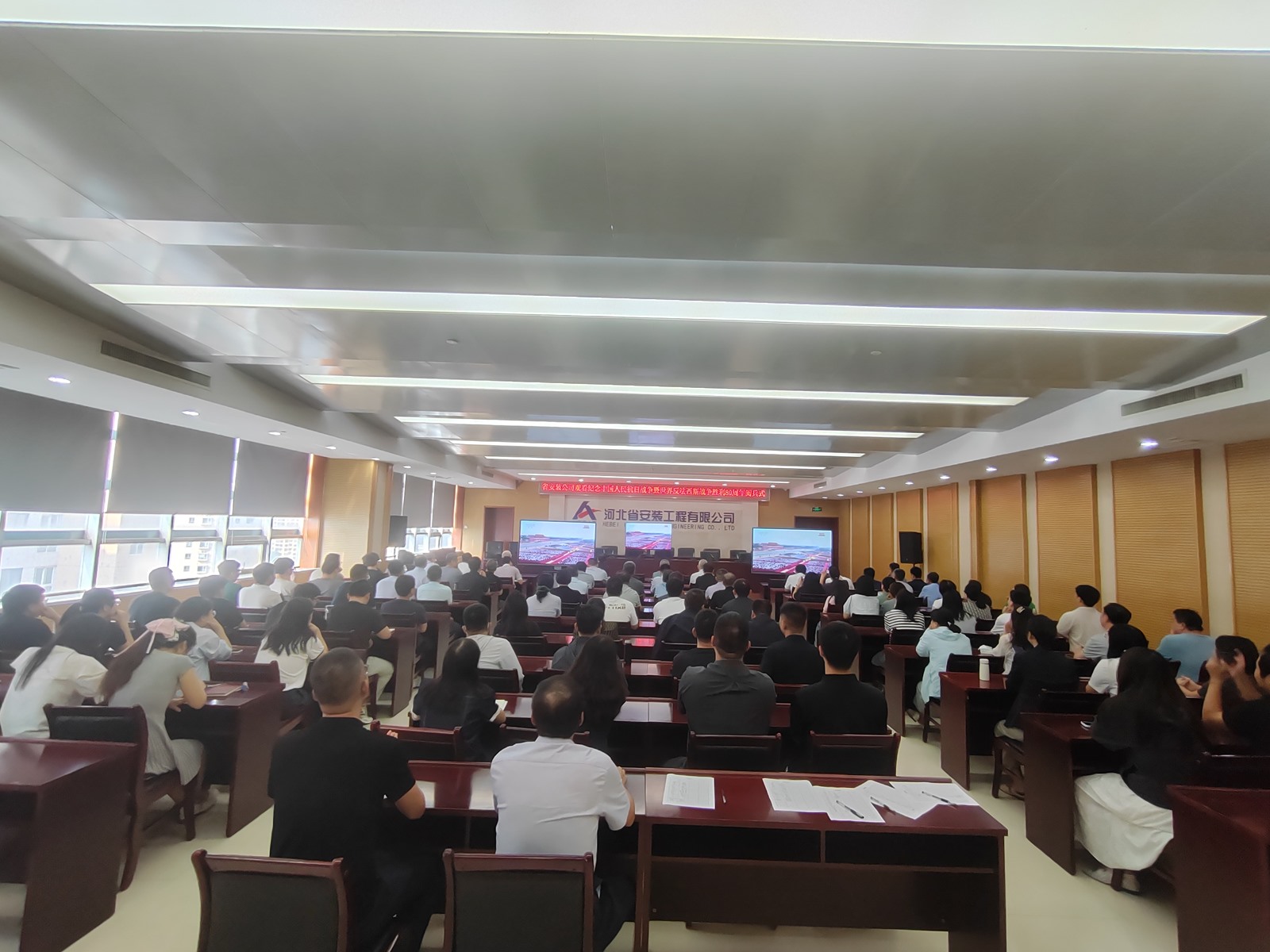 2025年9月3日,為紀(jì)念中國(guó)人民抗日戰(zhàn)爭(zhēng)暨世界反法西斯戰(zhàn)爭(zhēng)勝利80周年,河北省安裝工程有限公司積極組織職工集中觀看閱兵盛況直播。公司機(jī)關(guān)及各分公司、項(xiàng)目部共計(jì)2000余人通過(guò)多種方式同步參與,共同回顧歷史、緬懷先烈、展望未來(lái)。上午9時(shí),習(xí)近平總書(shū)記發(fā)表重要講話,9時(shí)19分大閱兵正式開(kāi)始,公司機(jī)關(guān)及各分公司、項(xiàng)目部會(huì)議室座無(wú)虛席,職工們們整齊地坐在屏幕前,神情莊重地注視著電視畫(huà)面。在閱兵式過(guò)程中,